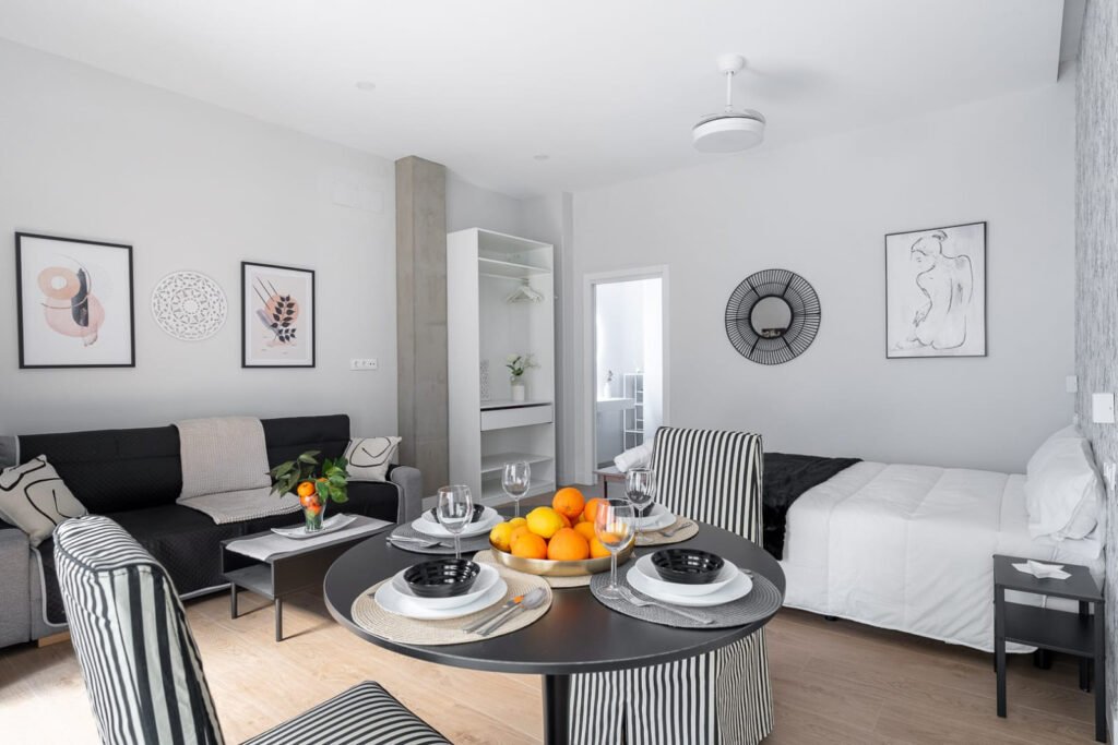 Este encantador estudio en Triana es un refugio urbano que maximiza el espacio y la comodidad. Al entrar, te encontrarás a la derecha con una cocina americana completamente equipada, que incluye electrodomésticos de última generación y amplios armarios.